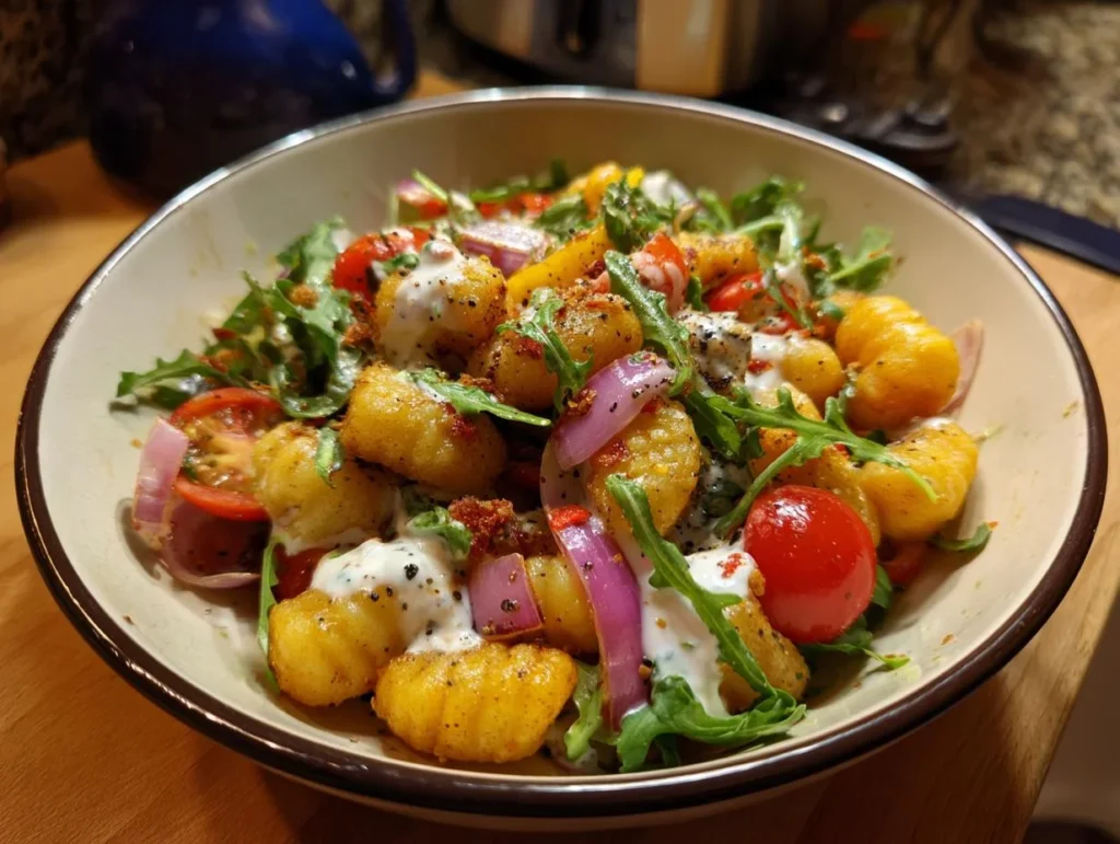 Ach, Salate! Ich liebe sie ja, aber manchmal muss es eben auch ein bisschen was Herzhaftes sein, gell? Kennt ihr das? Manchmal will man was Frisches, aber trotzdem Sättigendes. Und zack – da ist er, mein absoluter Lieblings-“Knuspriger Gnocchi-Salat mit Joghurt-Dressing”! Ehrlich, das ist so ein Gericht, das aus meinen spontanen Gelüsten entstanden ist. Ich stand in der Küche, hatte noch Gnocchi übrig und dachte mir: Warum nicht mal was HOLEN SIE SICH DAS REZEPT